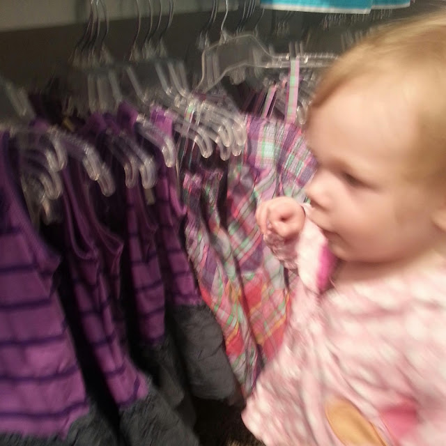 | I took Josie on her first ever shopping trip to pick out a Birthday Dress. She took right to that shopping thing. All over the store paging thru the racks of dresses. |